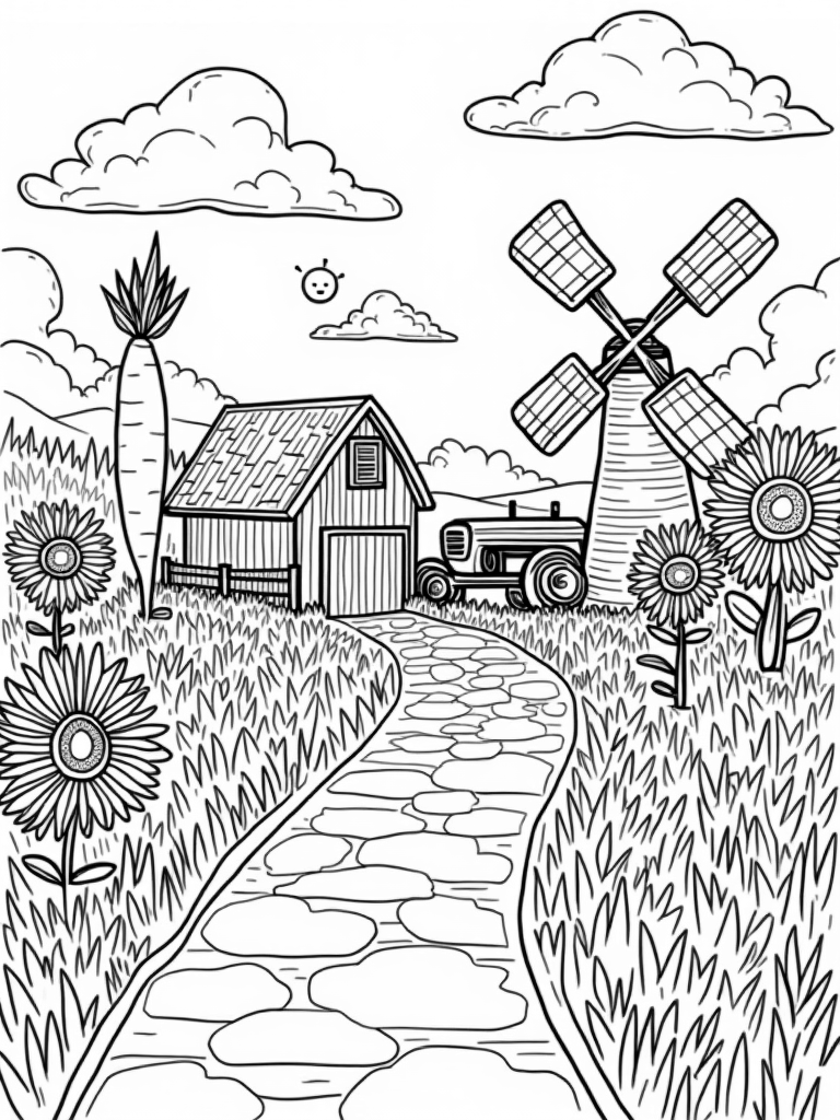 Look closely and you'll find a funny windmill with blades that look like giant spoons, just begging to be colored in bright, playful hues. Nearby, sunflowers stand tall beside a vintage tractor, which has wheels half-buried in fluffy clouds. And don’t forget to add some color to the smiling moon in the background—it’s all about fun and creativity!