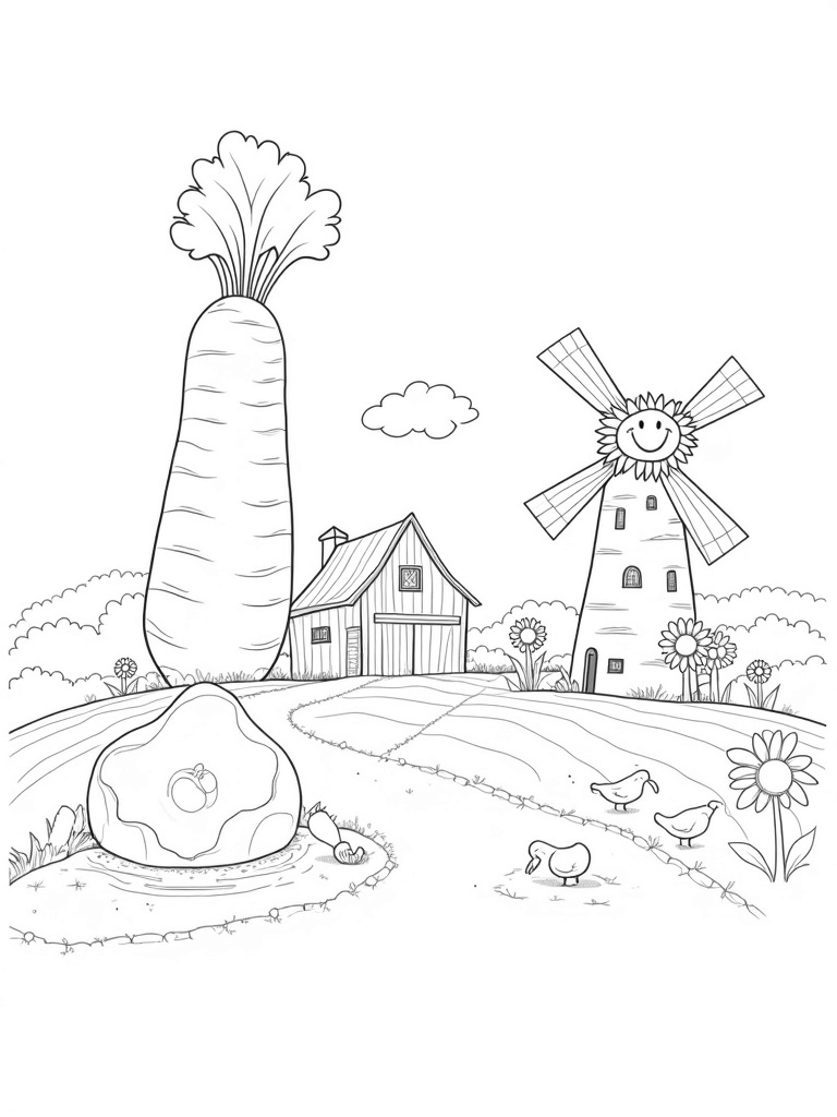 Imagine a farm where vegetables are as big as trees! In this delightful scene, a giant carrot stands tall next to a cozy barn, its leafy top almost touching the roof. Just nearby, a cucumber vine wraps around a rustic windmill, which has colorful flower petals decorating its blades. It's a place where everyday farm life meets a sprinkle of magic!
