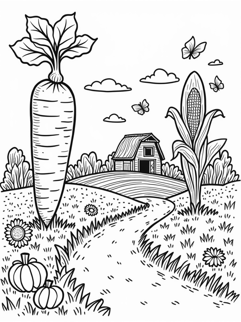 Picture a farm where the vegetables are much bigger than life! You’ll see a giant carrot arching over like a cozy gateway and a towering corn stalk reaching for the sky, all while colorful butterflies flit around. In the foreground, a patchwork of fields shows off bright sunflowers and cheerful pumpkins, each with its own fun pattern. A winding dirt path leads you to a charming barn with a thatched roof, nestled among fluffy clouds that look like playful farm animals.