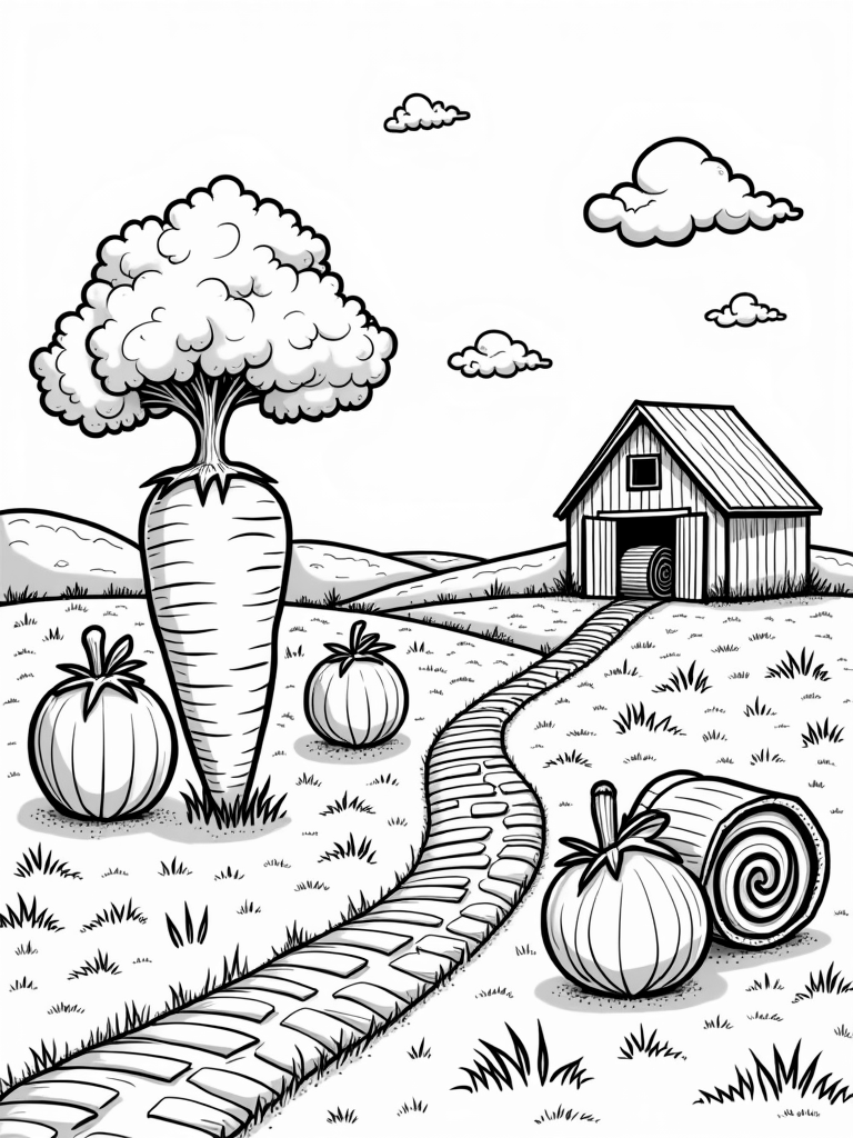 Picture a farm where the vegetables are so big, they look like they could be trees! There’s a giant carrot standing tall, with its leafy green top reaching up high. Nearby, a plump tomato rolls around, decorated with fun spirals that make it look extra special. A charming cobblestone path winds its way toward a cozy barn, its doors wide open to show off rows of patterned hay bales inside. And as if that wasn't enough, fluffy cloud-shaped chickens float in the sky, casting playful shadows on the colorful fields below.
