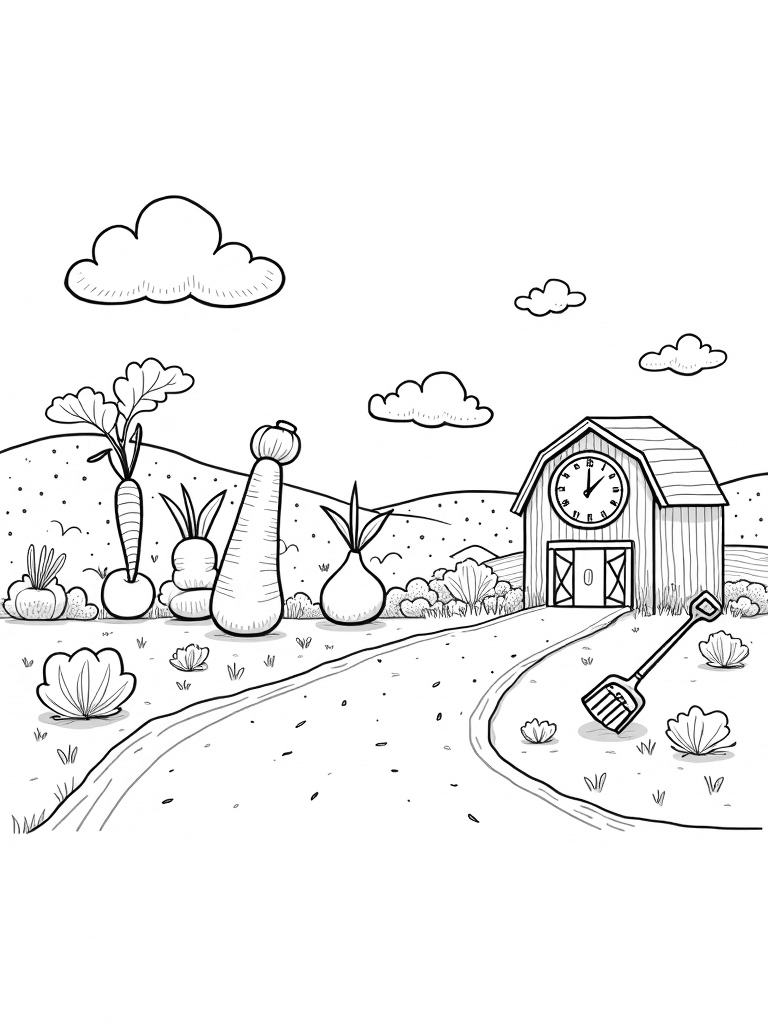 This delightful scene brings a farm to life like you've never seen! Imagine towering carrots that sprout up like trees, fluffy clouds floating by, and a giant zucchini arching over a winding dirt path. At the edge of the garden stands a barn made of colorful patchwork quilts, complete with a clock that tells the whimsical time of half past carrot. Look closely, and you'll spot playful farm tools like a giant pitchfork and a shovel that twist into fun shapes, just waiting for your creativity to fill them in.