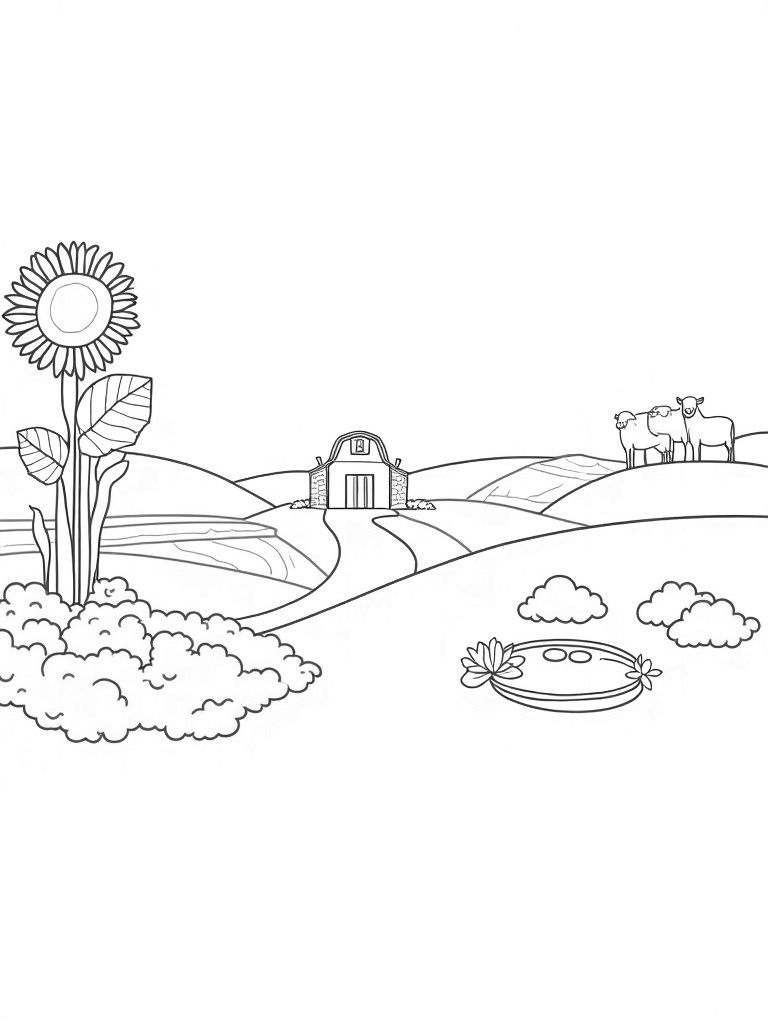 Follow the winding path made of hay bales to a unique pond shaped like a cow, where lily pads float gently on the water. In the background, rolling hills are home to fluffy, oversized sheep that seem to be grazing on clouds. It’s a delightful scene that invites your imagination to run wild as you color it in!