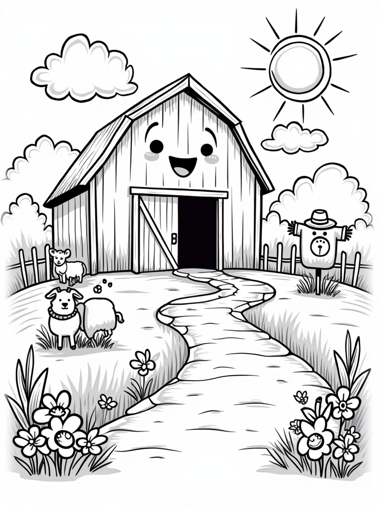 This coloring page showcases a delightful farm landscape bursting with charm. Imagine a giant, smiling barn with its big doors wide open, welcoming everyone inside. Right next to it, there's a path made of colorful stones that leads to a cheerful scarecrow wearing a floppy hat, surrounded by some cute veggies that seem to have their own little personalities.
