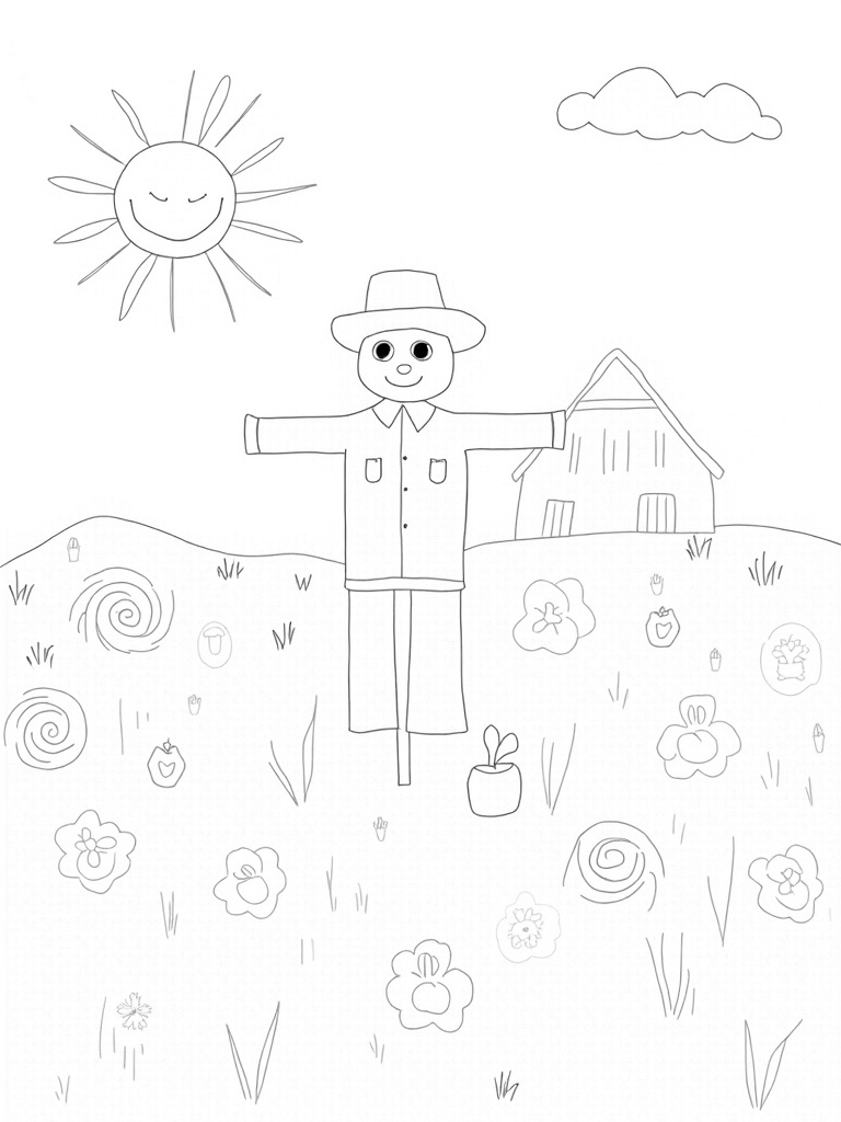 Sunny Farm with a Smiling Scarecrow Coloring Page