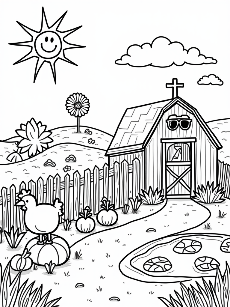 In this bright and cheerful scene, a giant sun wearing sunglasses beams down on a lively farm. Right in front, a happy barn stands with a crooked weather vane that adds to the charm. You can’t miss the huge carrot—it's practically the size of a kid! Right next to it, a plump tomato waits for some coloring magic.