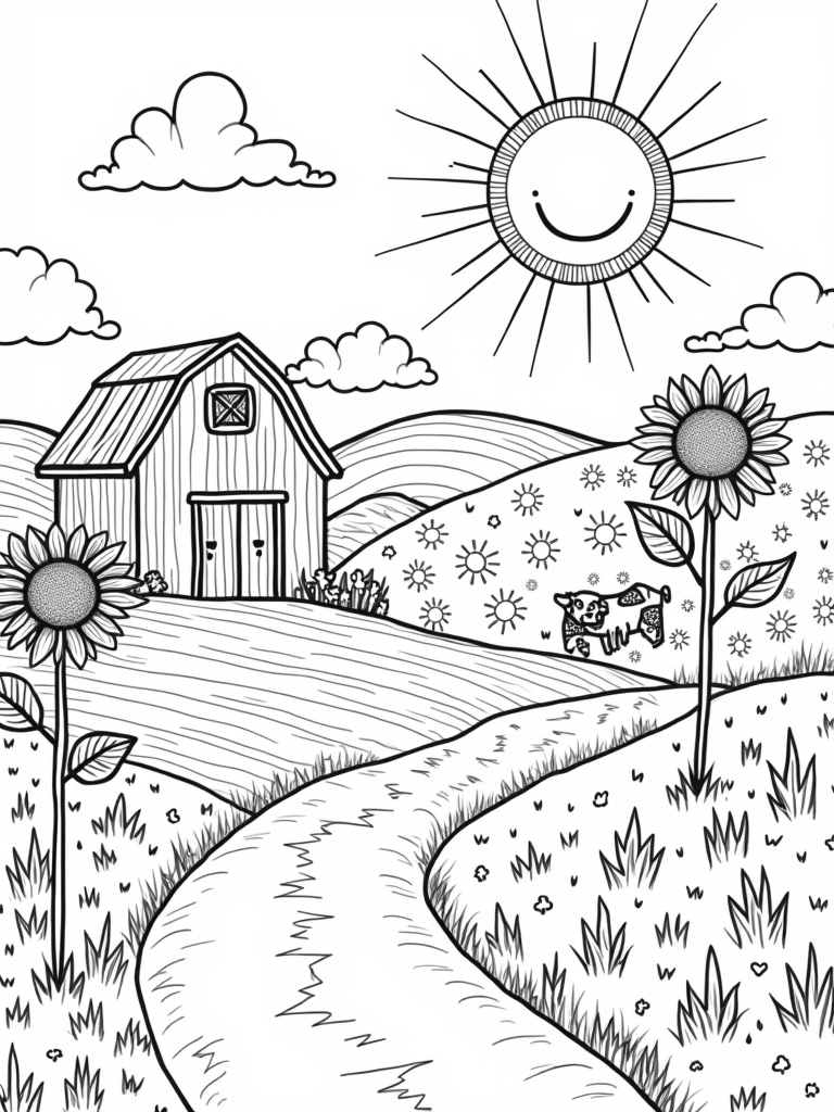 You’ll find a delightful farm landscape bursting with color! Picture rolling hills dressed in patchwork fields that seem to go on forever. A big, smiling sun lights up the scene, casting its warmth over a cozy red barn that has a charming, weathered wooden door. Nearby, tall sunflowers sway gently in the breeze, all leaning toward their sunny friend in the sky.