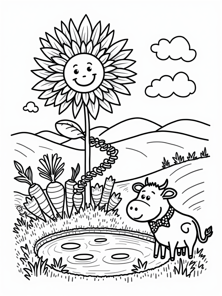 You’ll find a giant, smiling sunflower right in the center, and guess what? Its petals double as a spiral staircase leading up to a colorful treehouse made entirely of fruits! Nearby, there’s a patch of oversized carrots and radishes that look like they’re ready for a fun race, with their leafy tops fanning out like feathers. And don’t miss the friendly cow lounging by a bubbling pond, wearing a cute polka-dotted bowtie. The pond is dotted with lily pads shaped like hats, adding to the playful vibe.