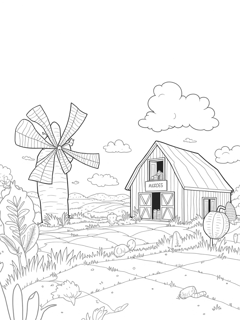 Vibrant Farmyard with Giant Vegetables and a Spinning Windmill Coloring Page