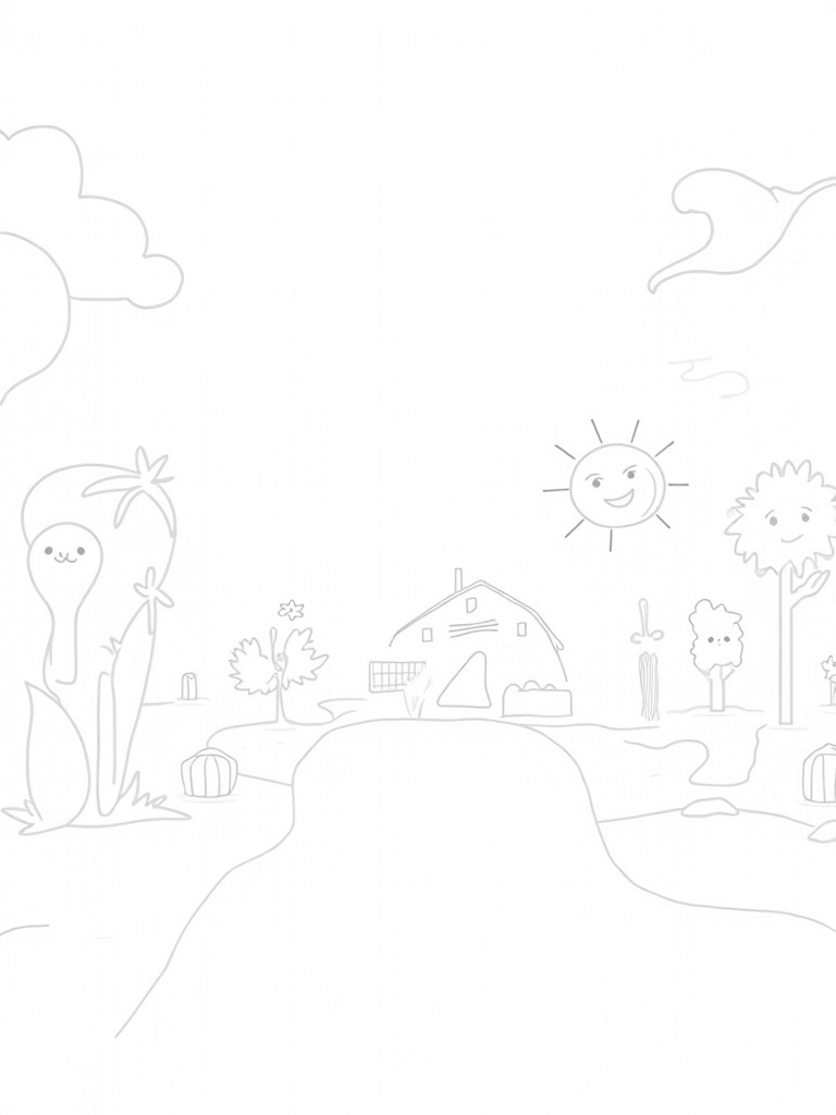 In the background, there's a quirky barn with a twisted roof that’s home to a spiral staircase reaching up into the fluffy clouds. It’s the perfect spot for a little adventure—or just a fun place to color! And let's not forget the big, smiling sun who beams down rays that turn into musical notes, filling the air with joyful tunes. This scene is sure to make your coloring time a happy experience!