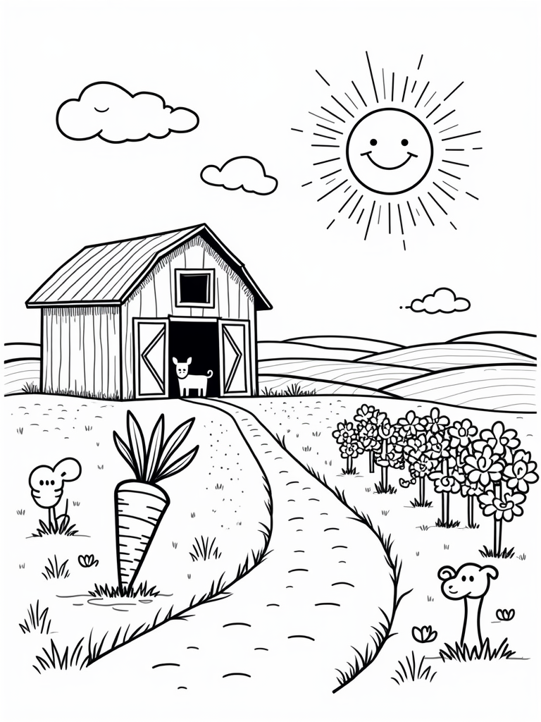 Picture a bright, sunny day on the farm! In this coloring page, a giant, smiling sun shines down on a patchwork of colorful fields. Right in the center, there's a cheerful barn with its doors wide open, inviting all the playful farm animals to peek out. Can you spot the cows, pigs, and maybe even a silly chicken?