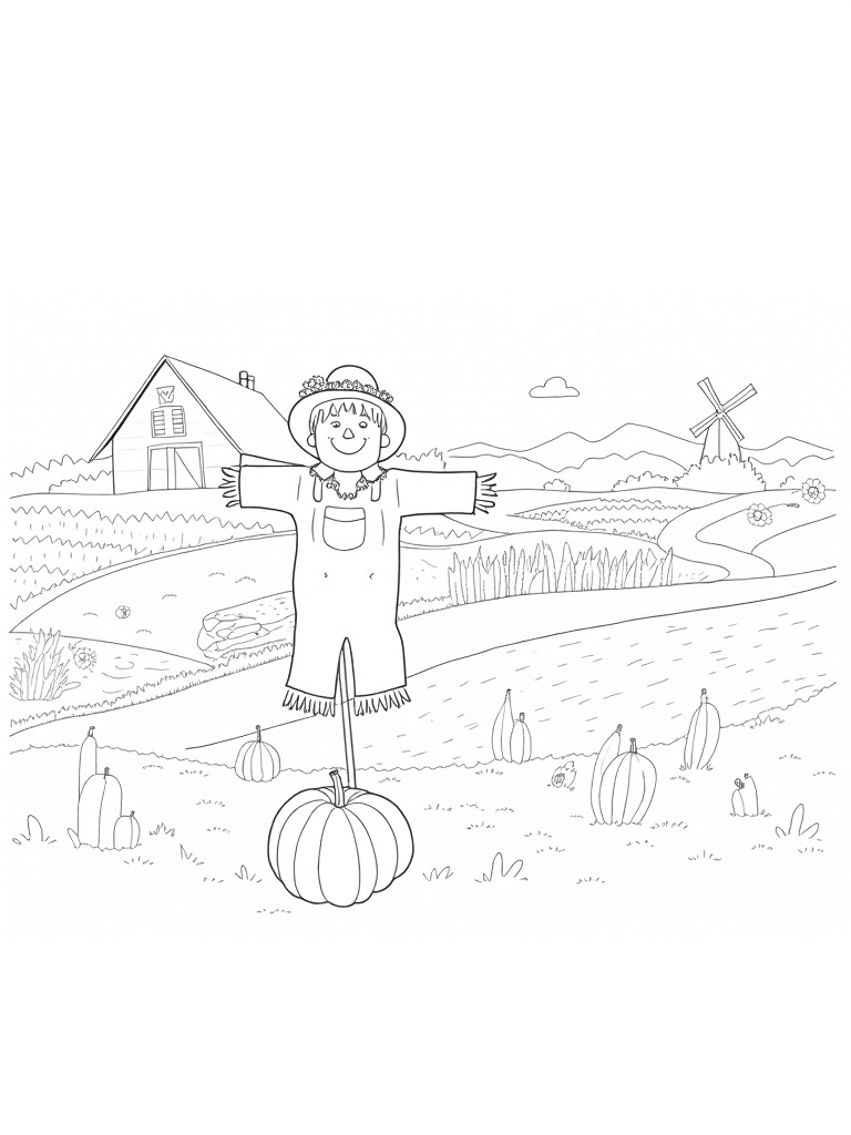 Colorful Farm Landscape with Smiling Scarecrow Coloring Page