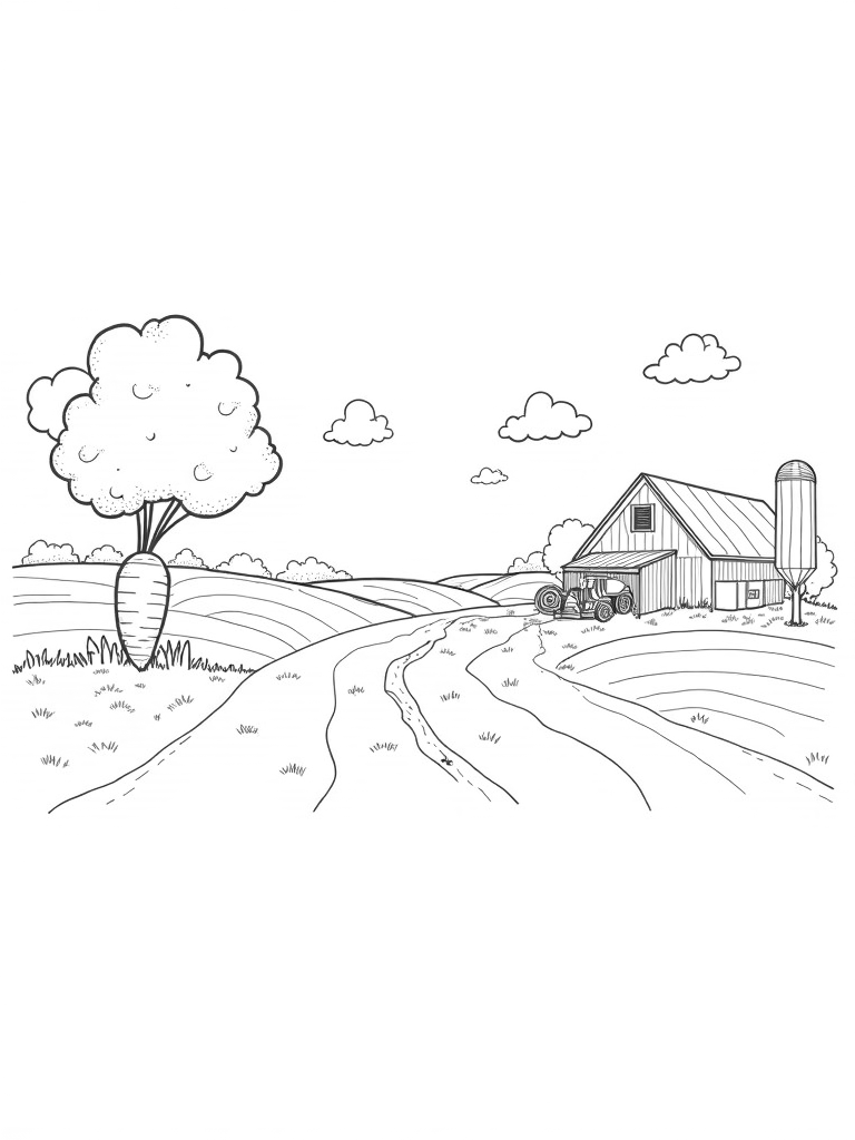 Check out this free, printable coloring page featuring a giant carrot, vibrant flowers, and a whimsical farm landscape! Perfect for kids who love to color, this fun scene is a great way to spark creativity in the farmer category.