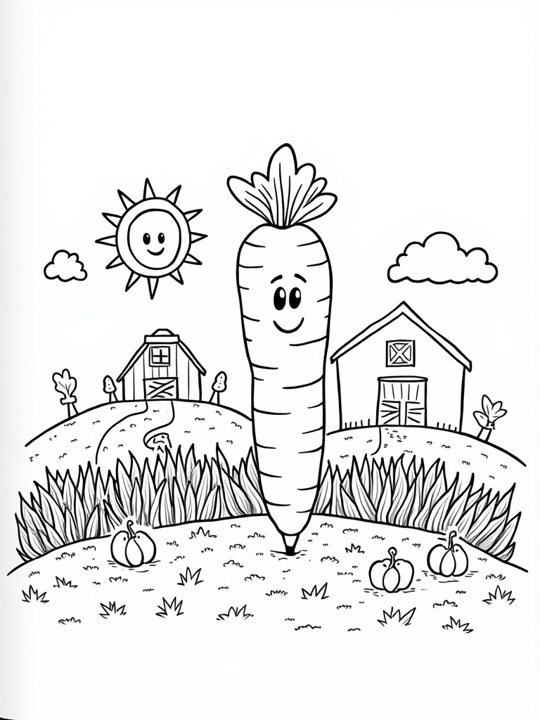 Check out this free, printable coloring page featuring a giant carrot, a cheerful scarecrow, and fluffy animal-shaped clouds. Perfect for kids who love farms, it's a fun way to get creative with colors!