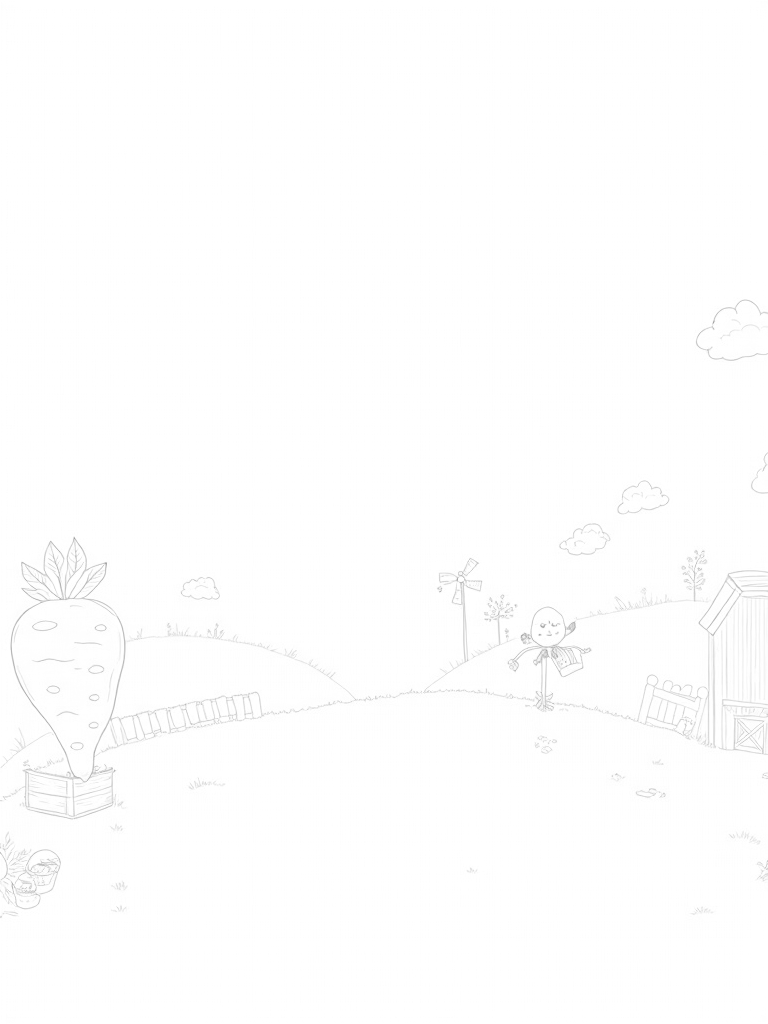 This coloring page shows a delightful farm landscape bursting with oversized vegetables that are sure to spark imagination! Picture a giant carrot towering over everything, with its leafy greens reaching for the sky. Right next to it, a plump tomato sits comfortably on a wooden crate, surrounded by swirling vines that playfully twist around a rustic fence.