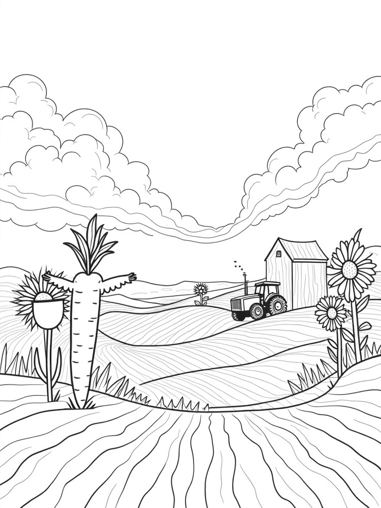 Get ready to color a delightful scene from the farmer category! This free, printable coloring page features a giant carrot, a friendly scarecrow, and whimsical clouds. Perfect for kids who love farm fun!