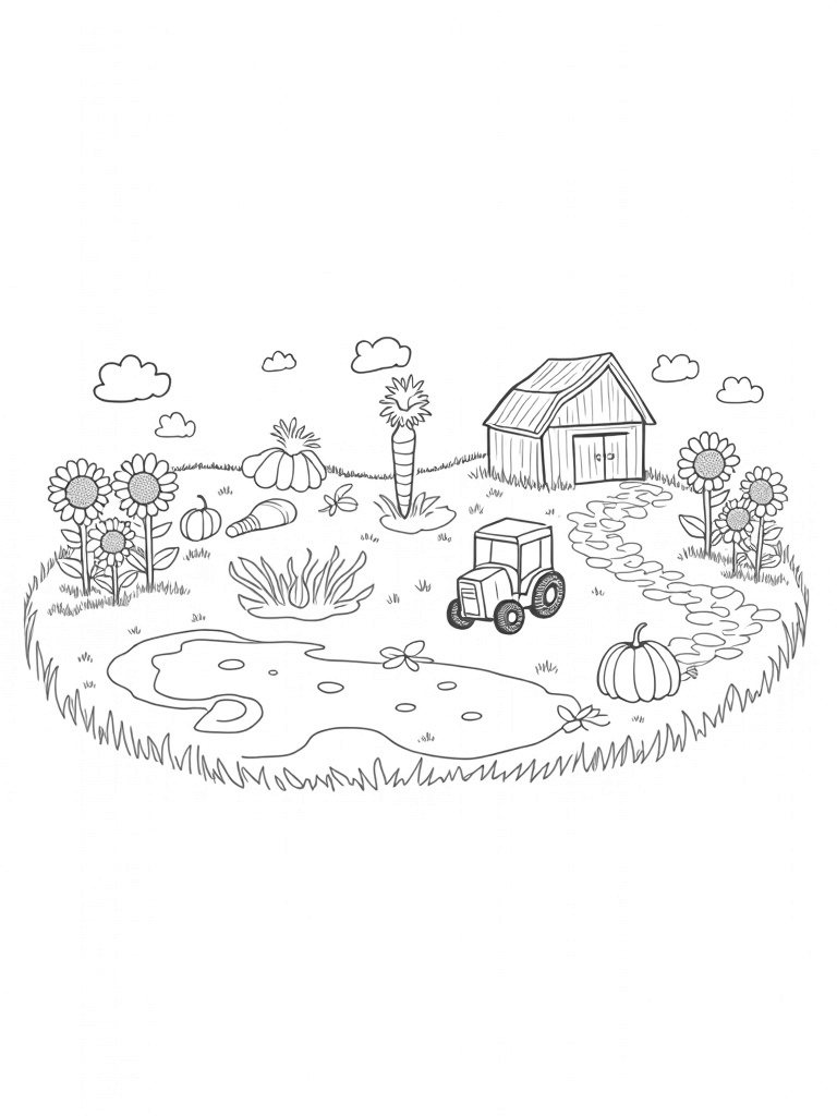 This page is all about a charming farm landscape where tall sunflowers stand like friendly guards around a circular patch. In the center, there’s a gigantic carrot that spirals up towards the sky, its lush green leaves looking like a fountain of happiness. It’s a sight that will spark creativity in every little artist!
