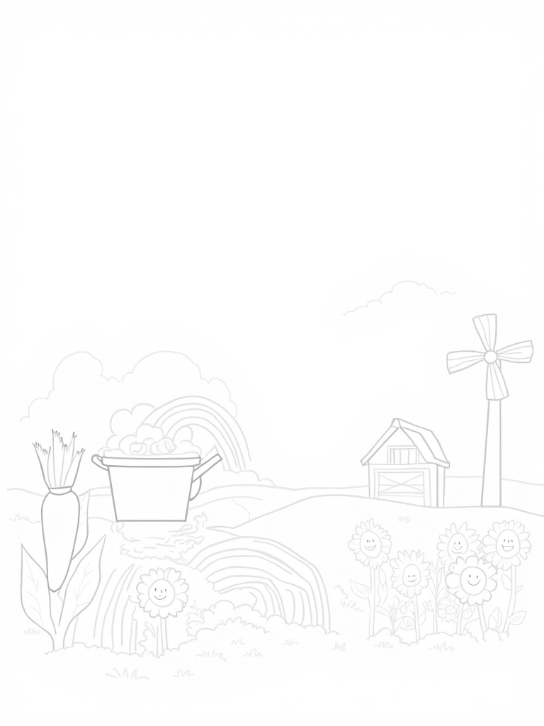 Check out this free, printable coloring page featuring a whimsical farm landscape! With a giant carrot bridge, smiling sunflowers, and a colorful windmill, it's perfect for kids who love to color and explore.