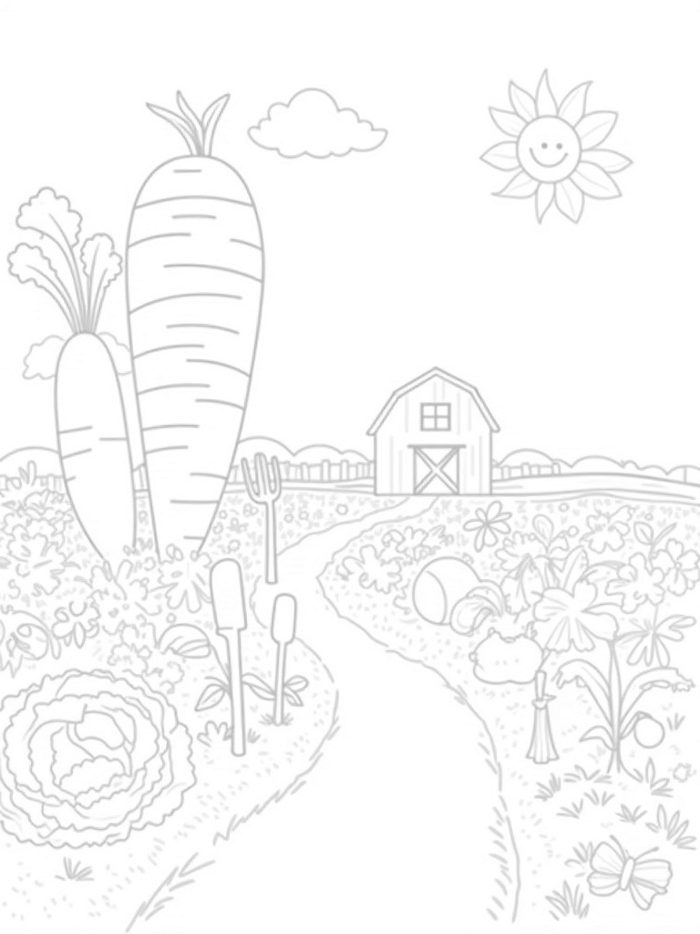 Imagine a farm where vegetables are as tall as buildings! In this fun scene, a giant carrot stands proudly next to a huge cabbage patch, surrounded by a burst of colorful flowers. There’s a winding wooden path guiding you through this magical garden, leading to a barn-shaped cloud floating lazily in the sky. The whole picture is filled with playful details that are just waiting for your favorite colors!