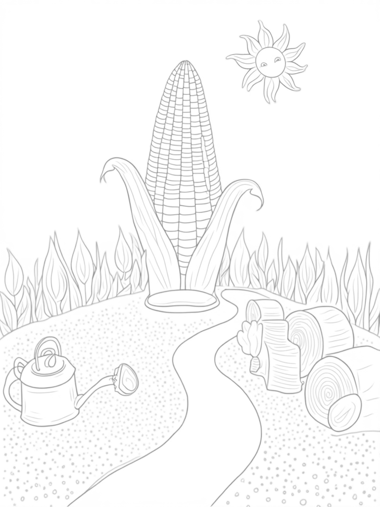 Giant Corn Cob Tower in a Colorful Farm Landscape Coloring Page
