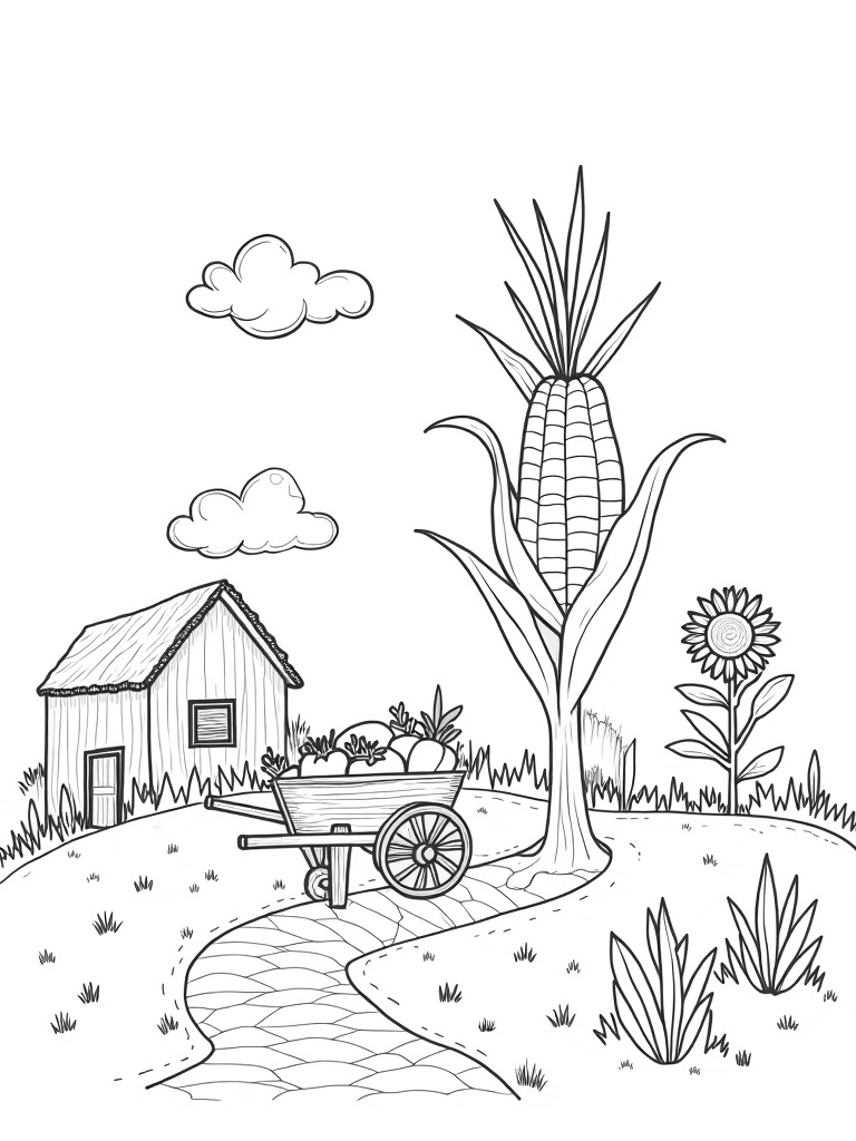 You’ll find a giant corn stalk twisting up into the sky, its leaves swirling in fun shapes that are just waiting for your favorite colors. Right at the base, there’s a wooden wheelbarrow that’s bursting with colorful veggies like big, plump tomatoes and oversized carrots. Imagine the delicious meals you could make with those!