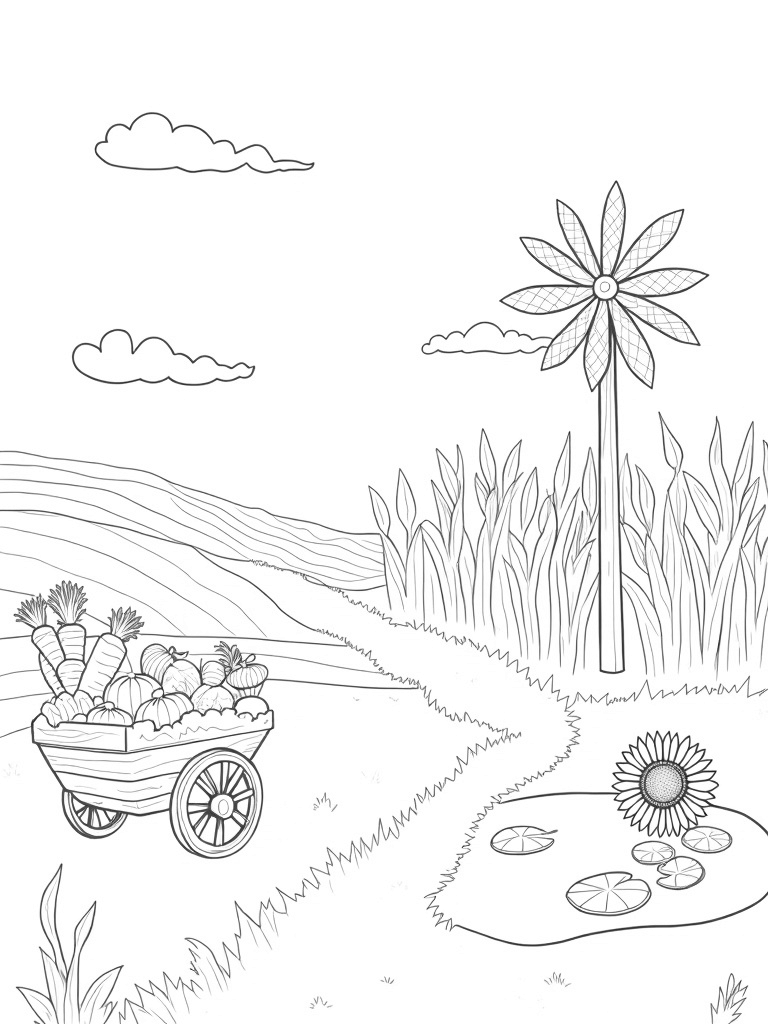 Check out the wooden wheelbarrow overflowing with enormous vegetables! You’ll find big, friendly carrots, plump pumpkins, and radishes that look like they’re ready for a veggie party. Each one is bursting with its own unique texture, just waiting for your favorite colors to bring them to life.