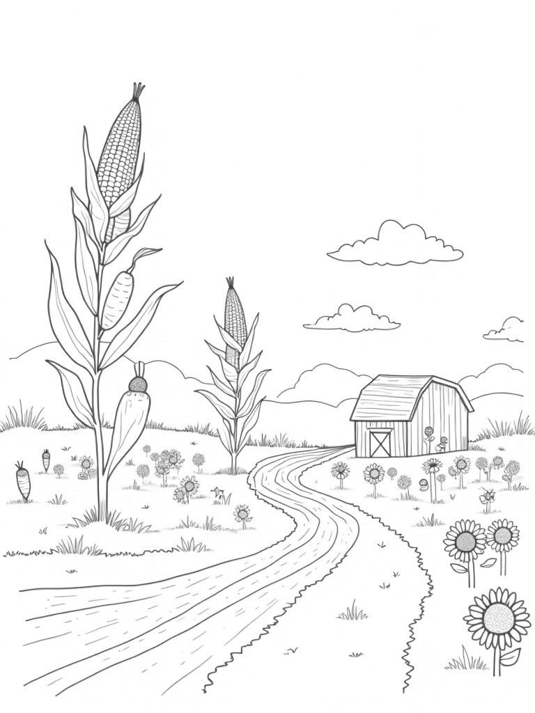 Grab your favorite crayons or markers and get ready to fill this whimsical farm with color. You can make the corn stalk bright yellow, the carrots a bold orange, and the barn a mix of your favorite colors. Let your imagination run wild! Maybe those clouds can be rainbow-colored or filled with your favorite patterns. The possibilities are endless!