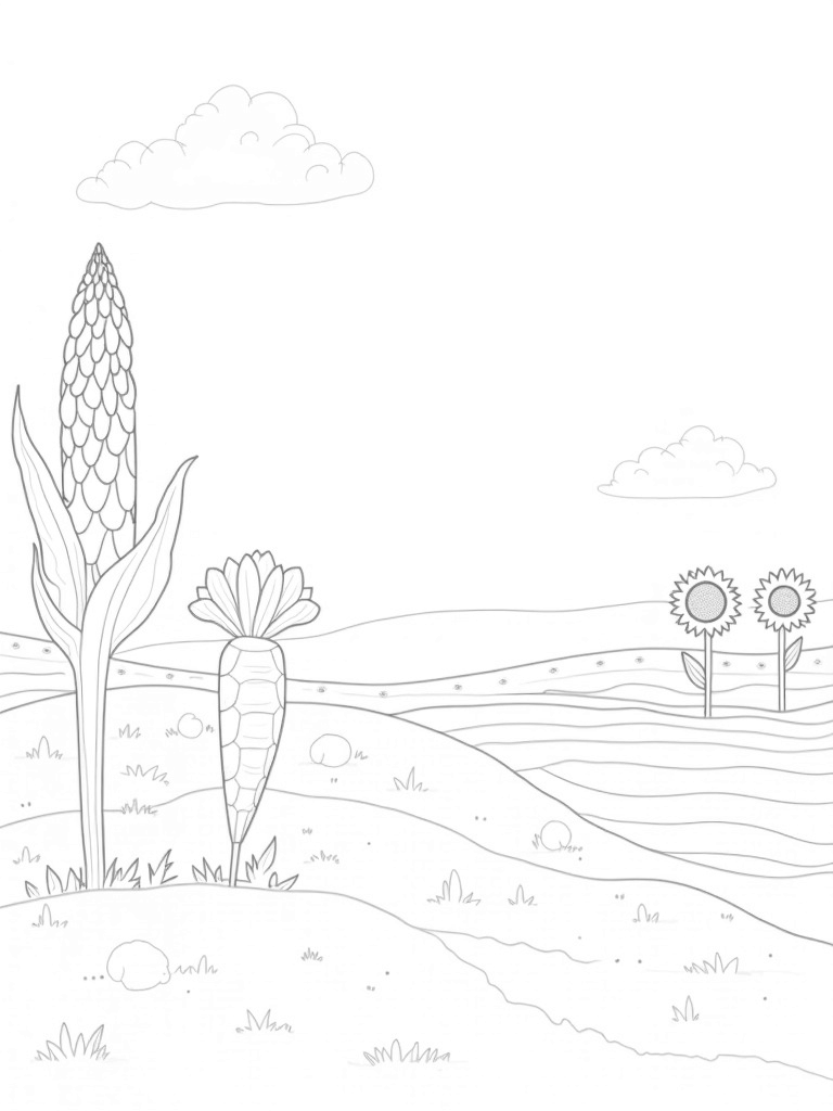 Grab your favorite coloring tools and let your imagination run wild! You can color the corn stalk in bright greens, the carrot in bold oranges, and choose any colors you like for the sunflowers. This page is perfect for all ages, so whether you’re a budding artist or just looking to relax, you’ll have a blast bringing this whimsical farm to life.