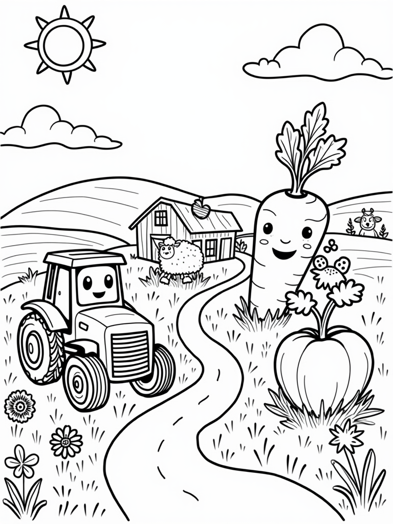 Imagine a sunny day on a farm where everything is cheerful and colorful! In this scene, a giant, smiling carrot stands tall over a patch of vibrant flowers, ready to bring a smile to any kid's face. Alongside, there's a playful tractor with oversized wheels rolling down a winding dirt path, leaving behind a sprinkle of tiny stars. How fun is that?