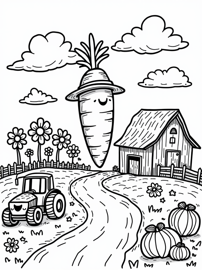 Check out this free, printable coloring page of a whimsical farm landscape featuring a giant carrot, playful clouds, and friendly pumpkins. Perfect for kids who love to color and have fun with farm themes!