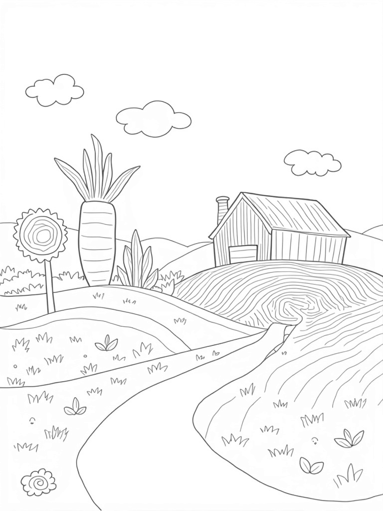 Check out this free, printable coloring page featuring a whimsical farm landscape with giant vegetables and a carrot-shaped barn. Perfect for little artists who love to color fun scenes full of life and imagination!