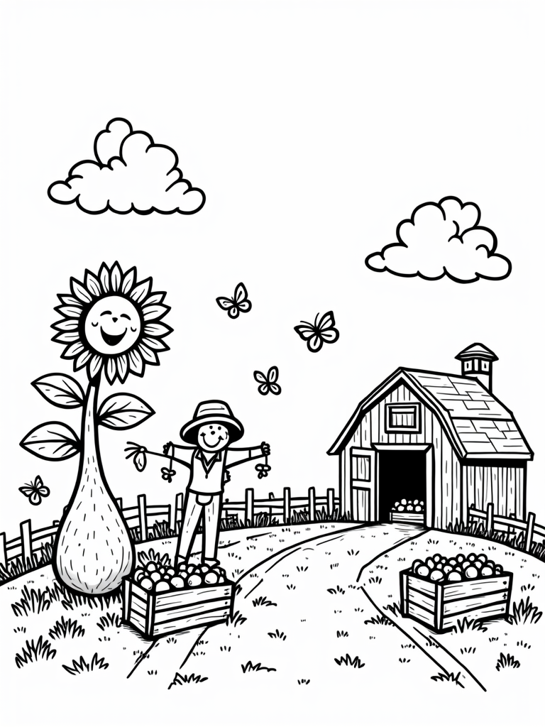 This delightful scene captures the charm of a farm where enormous vegetables rise above a colorful patchwork field. You can spot a cheerful sunflower smiling at everyone, its bright petals creating a sunny pattern. Not too far away, a friendly scarecrow with a floppy hat leans against a rustic wooden fence, surrounded by playful butterflies flitting about.