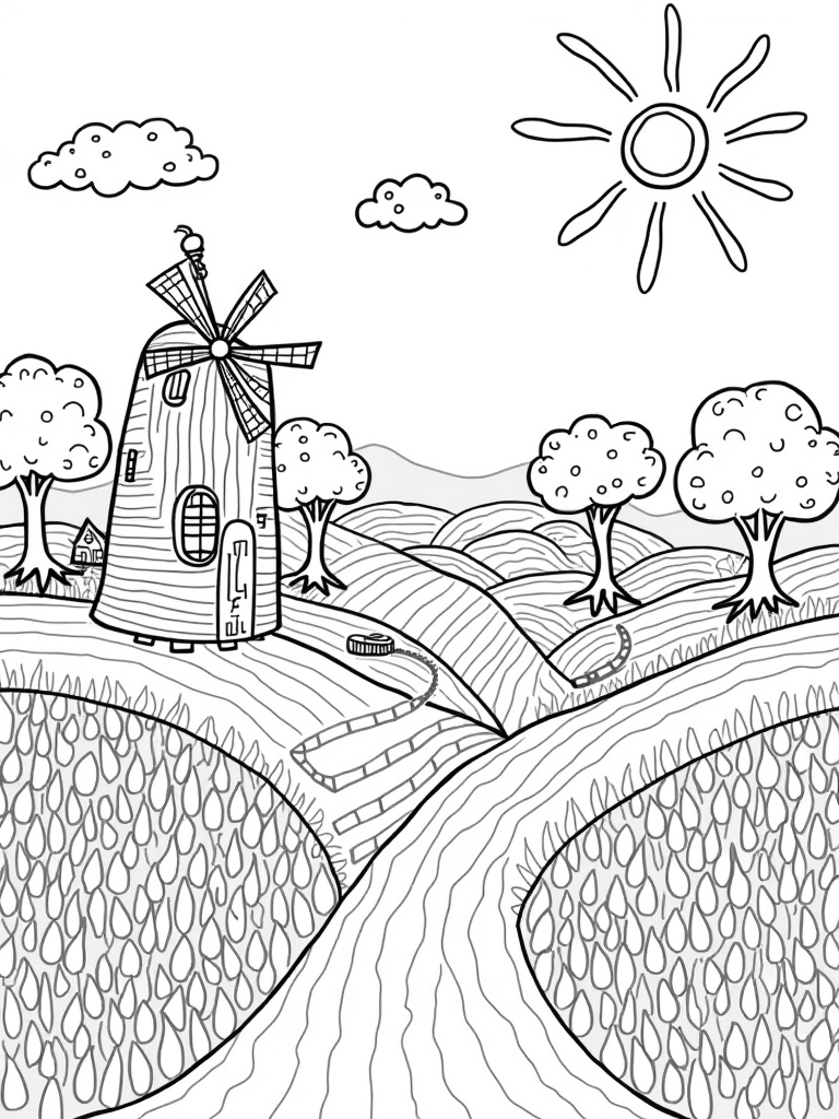Check out this free, printable coloring page featuring a whimsical farm landscape with giant vegetables and a charming windmill. Perfect for kids who love to color, this fun scene is sure to spark their imagination!