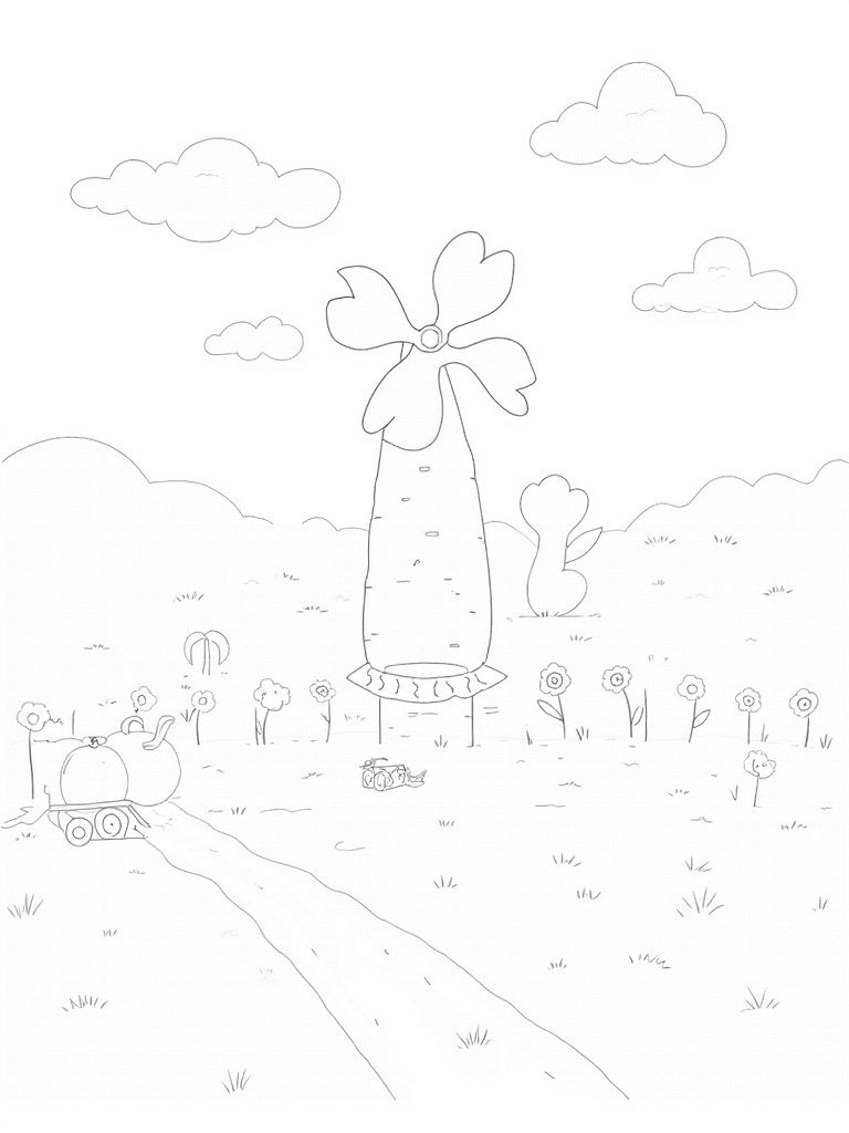 Giant Vegetables and a Whimsical Windmill Coloring Page