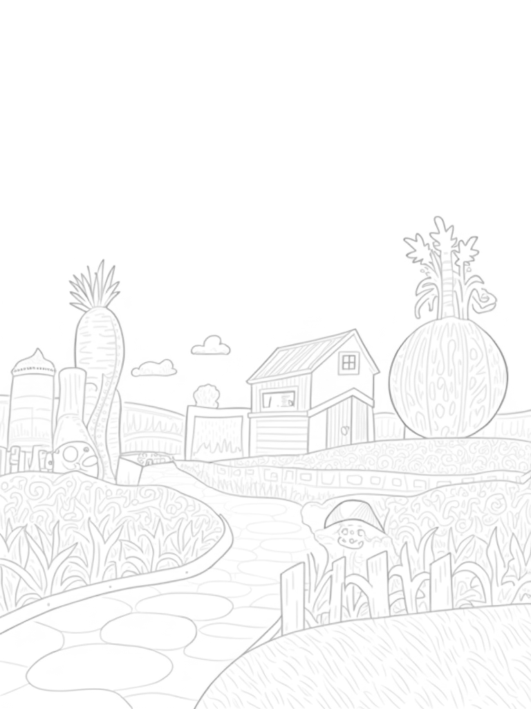 Giant Vegetables in a Whimsical Farm Landscape Coloring Page