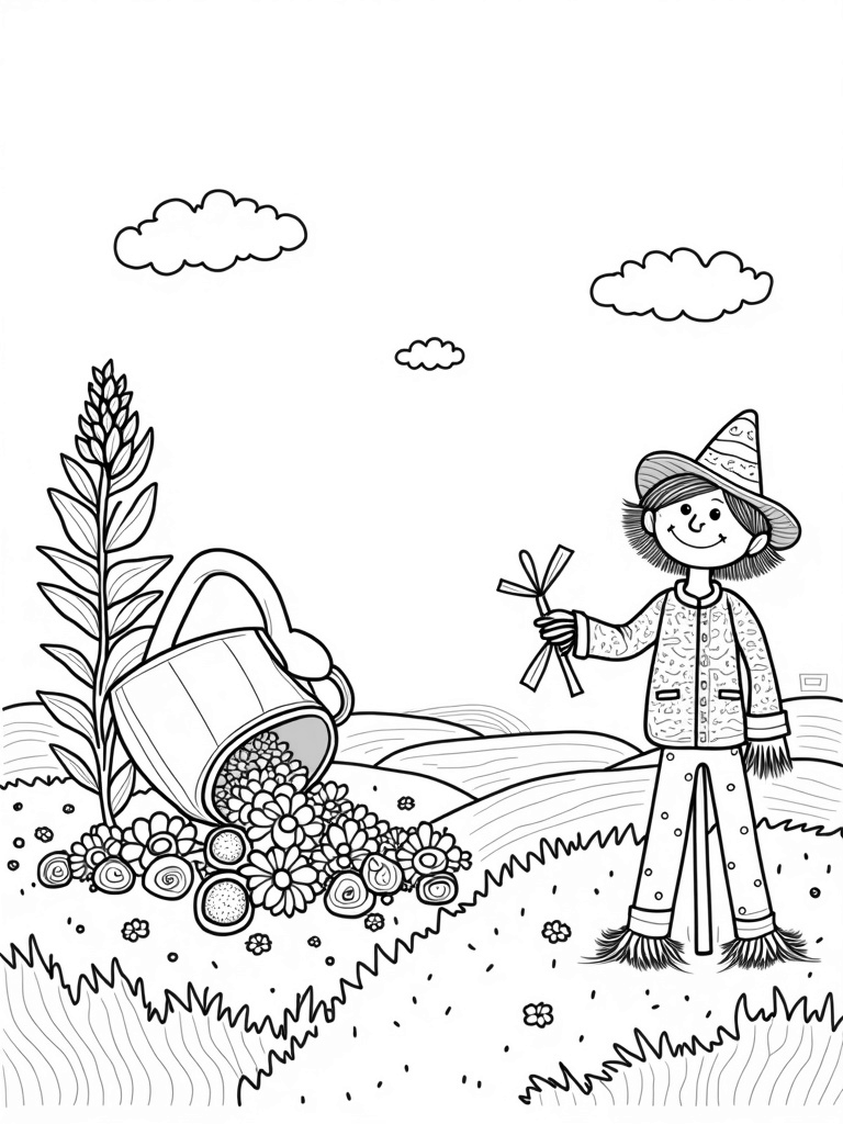 Giant Watering Can and Cheerful Scarecrow on the Farm Coloring Page