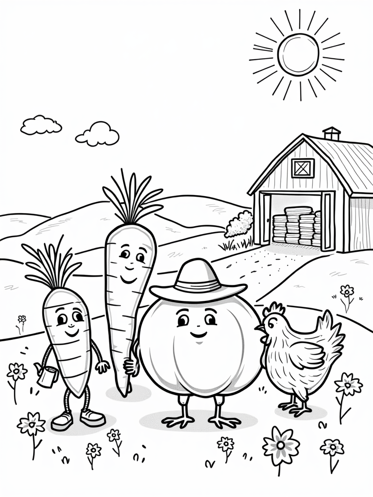 In this cheerful scene, you’ll see a happy carrot holding a watering can, ready to help the garden grow! Right next to it, a plump tomato sports a cute straw hat, adding to the fun vibe of the farm. Look closely, and you’ll spot a playful chicken pecking at the ground, surrounded by bright flower patches that make everything feel even more lively.