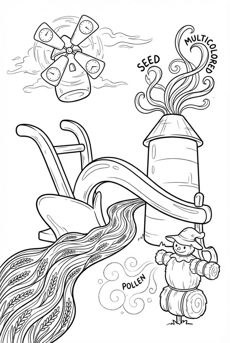 When you start coloring, think about mixing warm amber wheat tones with cool steel grays for the plow. The seed ribbons are a great chance to splash in any bright hue you like—maybe rainbow colors. The windmill can be a pastel sky or a bold primary palette, and the scarecrow’s hay bales look fun in yellows or oranges. Let the pollen clouds be light and airy with soft blues or pinks. There’s no right or wrong, just enjoy experimenting.