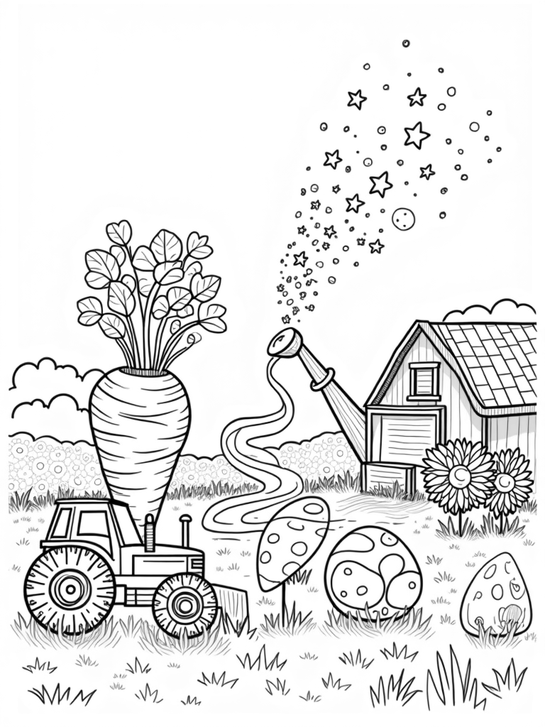 Check out this free, printable coloring page featuring a whimsical farm landscape with a giant carrot, patterned eggs, and a cosmic watering can. Perfect for kids who love to color and explore farm themes!