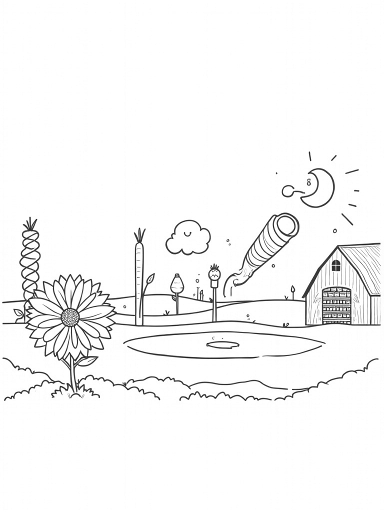 This delightful scene showcases a whimsical farm landscape where oversized vegetables tower like trees. You’ll spot a spiraling carrot tower standing proudly beside a colorful patchwork quilt made of vibrant crops. A giant watering can spills water that forms flower-shaped puddles, adding a splash of creativity to the scene. And don’t miss the enormous sunflower in the foreground, leaning down with a cheerful face, surrounded by its sunburst petals and a smiling cloud!