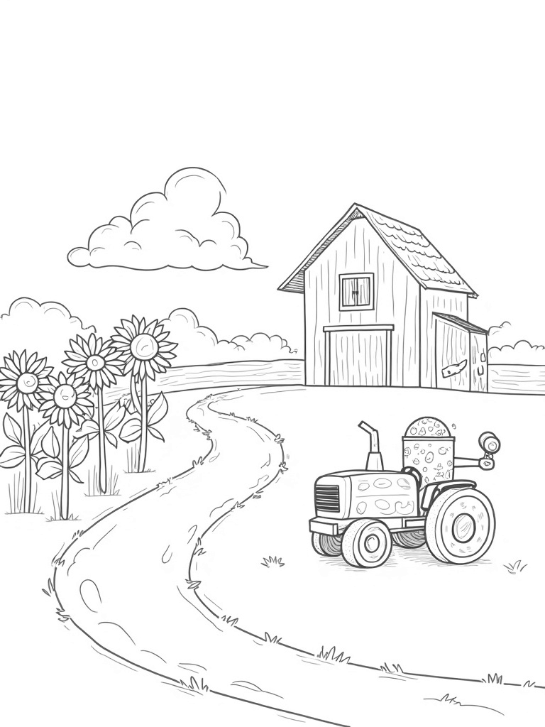 This coloring page brings to life a fun farm scene where giant vegetables stand tall like skyscrapers! You can see a winding dirt path that leads to a charming barn with a thatched roof, all dressed up in bright, playful patterns. Nearby, a massive watering can is pouring water onto a patch of cheerful sunflowers that seem to stretch their petals toward the sunny sky. And check out the tractor! It's not your typical farm vehicle; this one is made of fruit, with wheels that are oranges and a body made of crunchy green cucumbers.