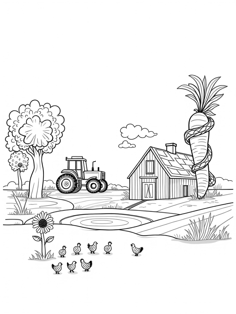 Imagine a farm where the vegetables are so big, they tower over everything like trees! In this delightful scene, there's a giant carrot with a winding staircase that spirals up to a lookout point made of vines. You can almost picture someone peeking out from the top, taking in the view of the colorful patchwork barn nearby. And just next to it, a tractor with super-sized wheels rests by a peaceful pond that reflects the fluffy clouds above.