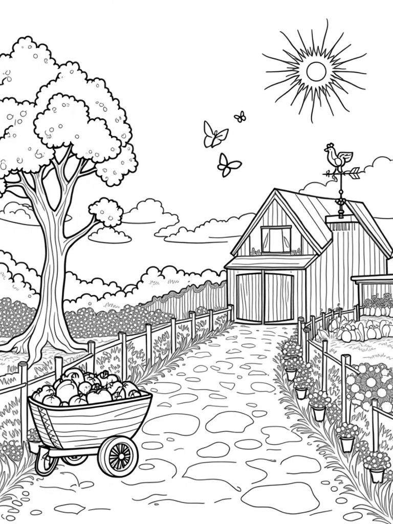 In the foreground, there’s a wooden wheelbarrow overflowing with colorful produce—perfect for a day of harvesting. And keep an eye out for the butterflies fluttering around; they add a splash of color and movement to the scene. In the background, a rustic barn stands proudly, with a charming weather vane shaped like a chicken, keeping watch over the farm.