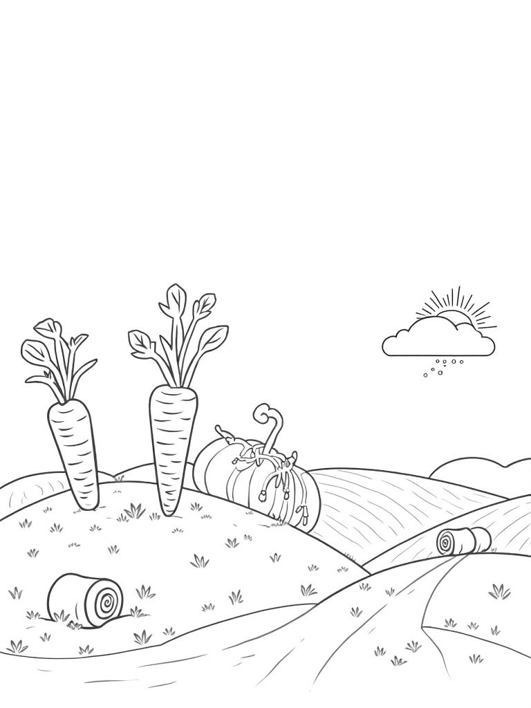 In this delightful scene, you'll find towering carrots that look like they could touch the clouds! Their leafy tops create a fun canopy above, while a giant pumpkin sits proudly on a hill, wrapped in a winding vine with charming little flowers. It's like stepping into a dream where veggies grow bigger than you can imagine!