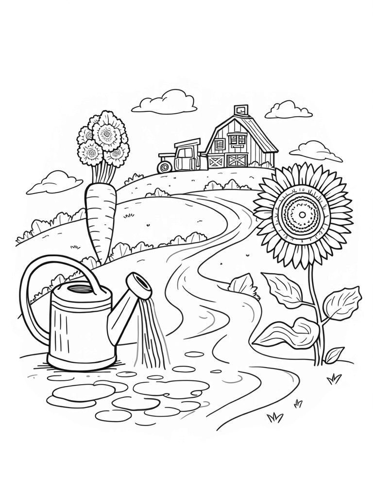 In front of all this, an oversized watering can is pouring out streams of water that create a winding river through the picture. You can even spot some lily pads floating on the water! This scene is bursting with details that will make your coloring experience enjoyable and creative.