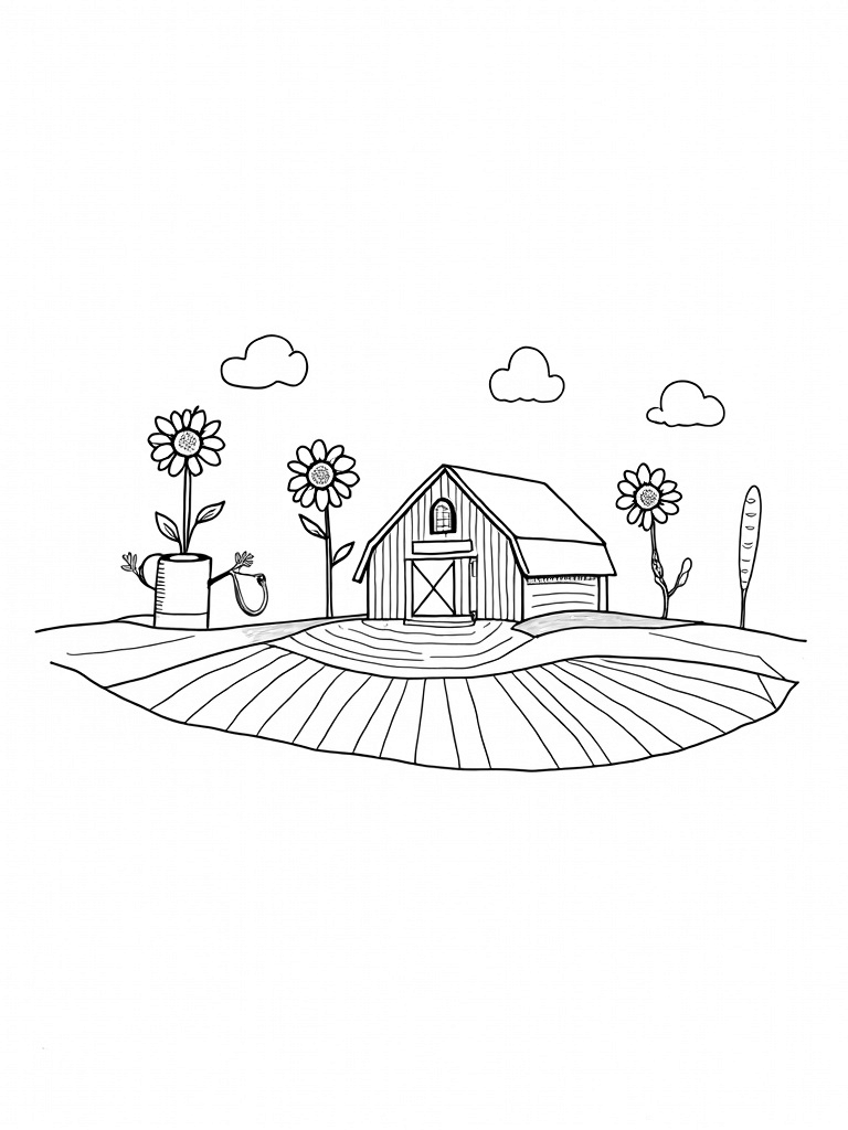 Patchwork Farm with a Whimsical Barn and Rainbow Watering Can Coloring Page