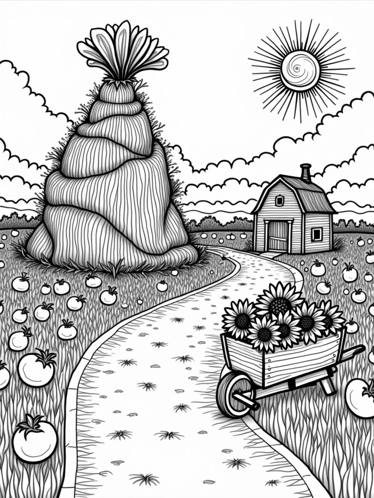 On this patchwork farm, you'll find enormous vegetables sprouting like trees! A winding dirt path invites you to stroll through fields filled with giant carrots and colossal tomatoes. Their vines twist and twirl overhead, creating a magical canopy. Right in the center, there's a towering spiral haystack that looks like a giant flower blooming in the sun.