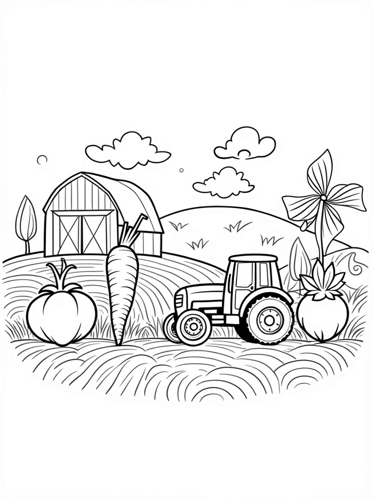 You’ll find a vibrant patchwork farm brimming with oversized vegetables, like a giant carrot standing proudly next to a colossal tomato. In the foreground, a cute tractor shaped like a ladybug is busy plowing through the swirly, patterned soil. It’s like a scene straight out of a storybook!