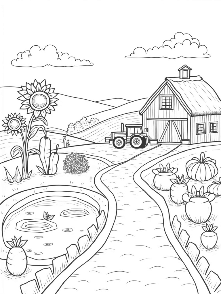 Just beside the barn, you’ll spot a vintage tractor parked next to a whimsical pond shaped like a watering can. It’s the perfect spot for some lily pads to float around, creating a peaceful vibe. Look up, and you might even see fluffy clouds shaped like farm animals lazily drifting across the sky. It’s a scene that invites creativity and imagination!