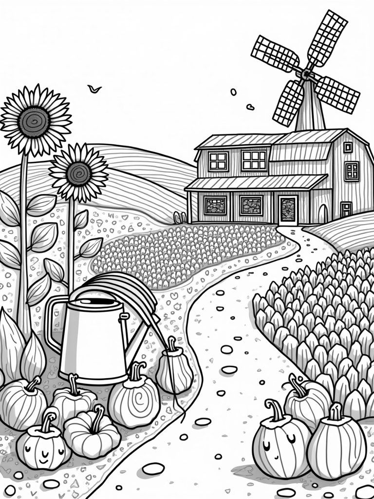 Look closely at the playful vegetables peeking out from the ground! They all have happy faces, making it hard not to smile while coloring them in. The giant watering can is spilling a rainbow of water over them, adding even more fun to this lively scene. And don’t forget the windmill in the background, spinning slowly with its beautifully patterned blades.