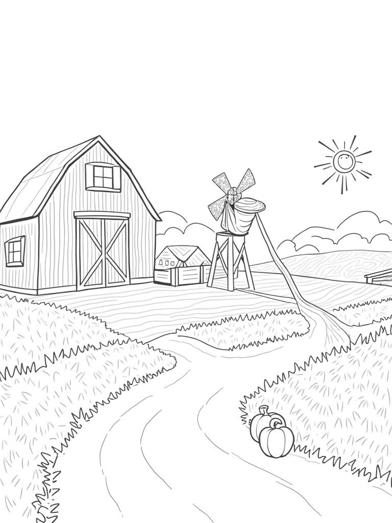Above it all, a happy sun with a big smile shines down, creating playful shadows on the ground. It’s a perfect day on the farm, and this coloring page captures all the joy and creativity of farm life. Grab your crayons and bring this scene to life!